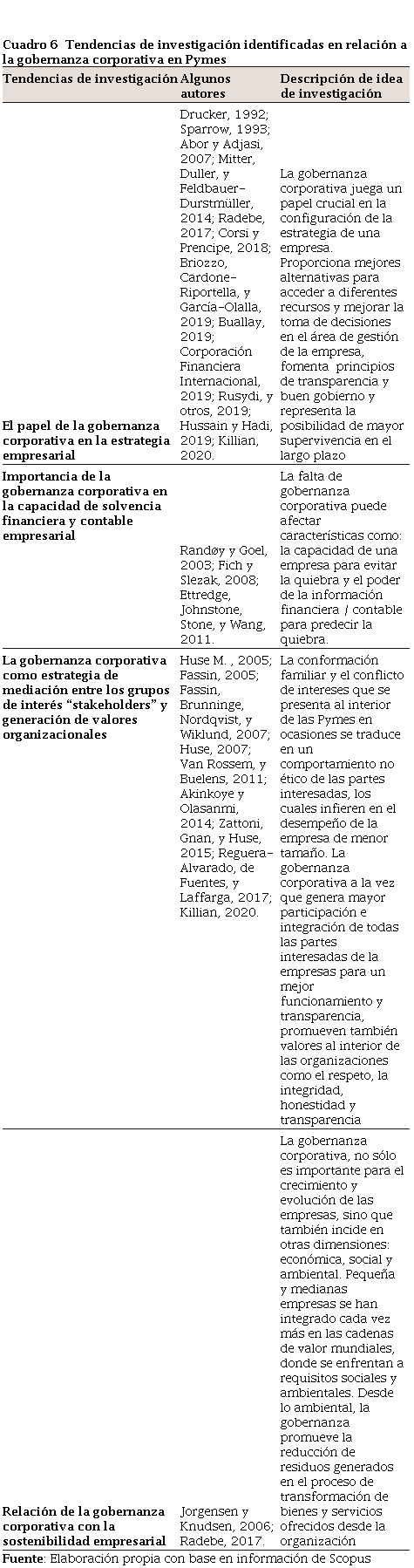 El crecimiento de investigaciones que consideran la gobernanza corporativa, las pequeñas y medianas empresas, así como su relación, gobernanza corporativa en Pymes, es evidente durante los últimos años. En el caso de la categoría de gobernanza corporativa, a partir del año 1971, empieza a desarrollarse desde el área de gestión y administración hospitalaria; sin embargo, desde finales de la década de los 80 se direcciona hacia el área empresarial orientada hacia subáreas de comportamiento económico y organizacional, economía financiera, economía gerencial y de decisiones, así como de estrategia empresarial. Para la categoría de pequeñas y medianas empresas, el interés empieza a desarrollarse a partir de 1947 al analizar la contribución de este tamaño de empresa en el financiamiento y factores comerciales, en el éxito empresarial y en la comercialización de bienes de consumo; a partir de la década de los 80 los estudios se centran en el acceso de las Pymes al uso de computadoras y a los servicios de información de red, la diferencia en el manejo del recurso humano en este tipo de organizaciones, el acceso a contratos comerciales, la financiación y la administración de recursos.