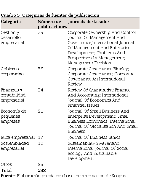 Específicamente, en la búsqueda de estudios relacionados con la gobernanza corporativa (corporate governance), Scopus arroja un total de 24.427 investigaciones y para el caso de publicaciones de pequeñas y medianas empresas (small and medium businesses or SMEs) se obtienen 86.417 resultados; sin embargo, unificando los criterios tenidos en cuenta Los resultados de esta búsqueda, son concluyentes respecto al crecimiento de la producción de cada una de las categorías relacionadas en esta revisión, siendo principalmente evidente para las categorías individuales de gobernanza corporativa y pequeñas y medianas empresas a finales del siglo XX. La relación de gobernanza corporativa en Pymes empieza a desarrollarse en el año 1995, tomando mayor crecimiento a partir del año 2007. Uno de los autores Las áreas temáticas en las cuales se desarrollan los estudios corresponden a: negocios, gestión y contabilidad, economía, econometría y finanzas y ciencias sociales, principalmente. Así mismo, el siguiente cuadro muestra como estas áreas son desarrolladas en revistas categorizadas especialmente en temas de gestión y desarrollo empresarial, gobierno corporativo, finanzas y contabilidad empresarial, economía de pequeñas empresas, ética empresarial y sostenibilidad empresarial, en donde las investigaciones son principalmente publicadas. El cuadro 5, muestra esta categorización: