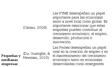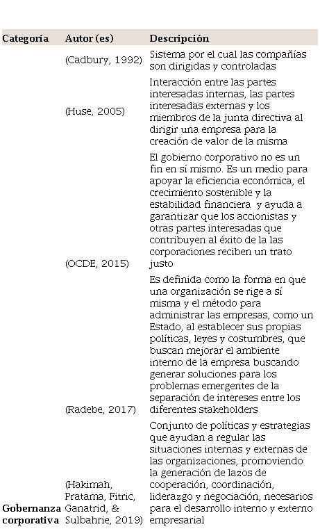 En la literatura existen diversas definiciones de gobernanza corporativa, así como, diferentes concepciones de pequeñas y medianas empresas. Para el caso de las Pymes, su definición es particular a la región en la que se originan y de su marco regulatorio, clasificada jurídicamente según el número de empleados, ingresos anuales, activos registrados y sector al que pertenecen (Kumar, Rajan, & Zingales, 1999; Nieto, Timoté, Sanchéz, & Villareal, 2015). El origen de la gobernanza por su parte, radica en la gobernabilidad de las naciones y la toma de decisiones que deben estar orientadas al logro de objetivos y al beneficio de la sociedad en general (Arellano, 2014), pero no se limita sólo a la estructura y al plano político sino también a la manera de hacer gobierno, por la autoridad, por el mercado, y por las relaciones y las asociaciones (Zurbriggen, 2011). La noción se ha transformado a través de los años hasta llegar a entornos privados y de gestión empresarial a partir de la denominada gobernanza corporativa; la cual surge a partir de la necesidad de crecer como unidad pública o privada, y generar mayores lazos de confianza entre dueños e inversores o también llamados shareholders, y entre todos los grupos de interés, denominados stakeholders (OCDE, 2004). La Cuadro 1 señala algunas definiciones claves de las categorías de análisis de ésta revisión: