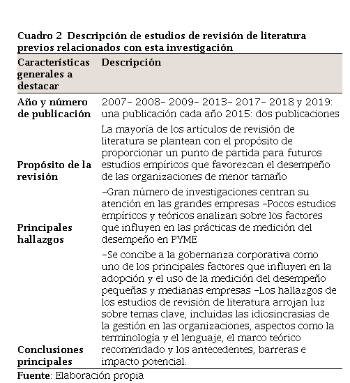 2015; O’Shannassy, 2015; JimenoGonzalez, Ariza-Colpas, y Piñeres-Melo, 2017; Levstek, Hovelja, y Pucihar, 2018; Kumar, Sureka, y Colombage, 2019), ninguno de ellos desarrolla una revisión sistemática de literatura, lo que hace evidente la necesidad de proporcionar una visión general de estudios sobre gobernanza corporativa en pymes con el propósito de contribuir a las discusiones actuales y a las futuras investigaciones que favorezcan el desempeño y crecimiento de este tamaño de empresas.