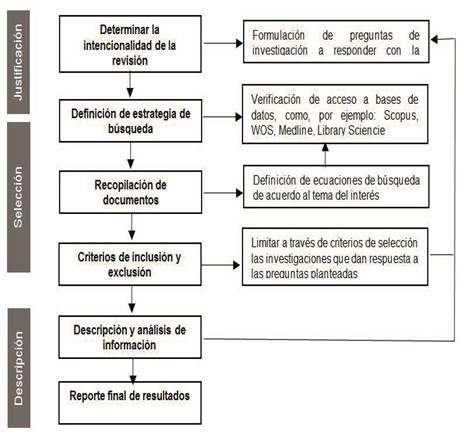 Estos autores, en términos generales, plantean la revisión en fases relacionadas con: la identificación de las preguntas a responder con la revisión, definición de estrategia de búsqueda, recopilación de documentos, criterios de inclusión y exclusión de documentos, descripción y análisis de información y el reporte final con la descripción de los principales resultados (diagrama 1):