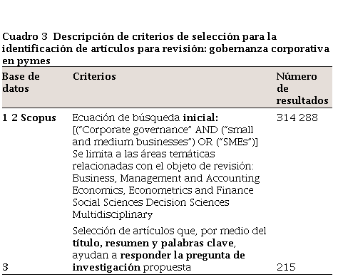 Una vez establecido el proceso de revisión sistemática, para dar respuesta a la intencionalidad de esta exploración de literatura, la ecuación de búsqueda definida fue: [(“Corporate governance” AND (“small and medium businesses”) OR (“SMEs”)]. Con base en esta ecuación se inició la búsqueda en la base de datos de Scopus, dado el acceso libre con el que se cuenta por la filiación institucional. Este primer criterio de exploración arrojó 314 resultados, que corresponden a los estudios que relacionan el concepto de gobernanza corporativa en las pequeñas y medianas empresas (Pymes); tal y como muestra Partiendo de los resultados de la ecuación de búsqueda anterior, y teniendo en cuenta que lograr una definición viable y establecer criterios de inclusión y exclusión es un objetivo importante para la primera fase de revisión de literatura (Badger et al, 2000), se realizó un primer criterio de selección al limitar la búsqueda a las áreas temáticas relacionadas con la temática propósito de este estudio, como: negocios, gestión, economía, finanzas, ciencias sociales, ciencias de decisión y áreas multidisciplinarias (cuadro 3), esto con el objetivo de delimitar los documentos que relacionan la gobernanza corporativa en las Pymes; de esta manera se obtiene un total de 288 artículos de investigación. Finalmente, se llevó a cabo un nuevo criterio de selección, considerando la afirmación realizada por Velásquez (2015:10): “una revisión de literatura crítica y profunda puede ser únicamente posible cuando el número de estudios es limitado”. Este nuevo criterio parte de la selección los artículos que, por medio del título, resumen y palabras clave, podrían ayudar a responder las preguntas de investigación propuestas, considerando así 215 artículos para desarrollar la revisión sistemática de literatura (ver cuadro 3):