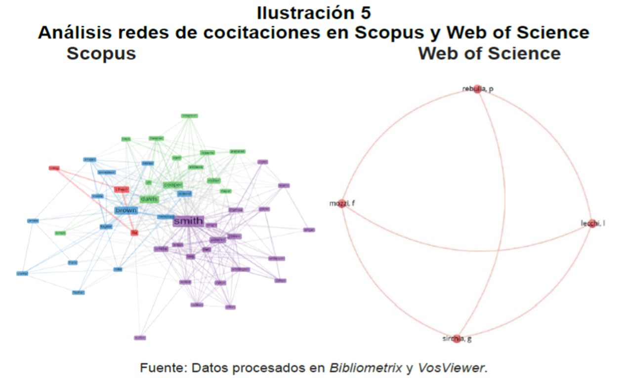 Dentro de la red de cocitaciones que se representa en la ilustración 5, por el lado de Scopus se observa que Smith, J. S. es el principal autor con el mayor número de conexiones, la línea de investigación de este autor se centra en el área de la salud, publicando una gran cantidad de documentos que tienen relación con temas de enfermedades de la medula espinal, cifosis, escoleosis, entre otras. En la misma línea investigativa se encuentran a Davis, L. quien publica documentos sobre enterobacterias resistentes a carbapanemicos, actividades de administración de antimicrobianos, entre otros. En una línea investigativa diferente aparece Cooper, W. W. publicando documentos sobre honorarios de auditoría, servicios que no pertenecen a la auditoría, independencia del auditor, gestión de riesgos empresariales, productividad empresarial, entre otros.