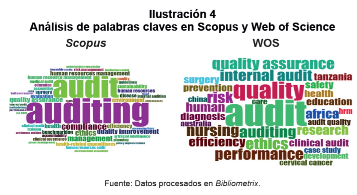 Analizando los conceptos claves que derivan de las investigaciónes científicas sobre auditoría de recursos humanos en las bases de datos Scopus y Web of Science, se observó que no se trata el tema de manera específica, es decir, solo se encontraron conceptos separados y relacionados indirectamente, tal como lo son, auditing y human resources management en el caso de Scopus, mientras que en la búsqueda realizada en Web of Science, los conceptos que más se repitieron fueron audit, quality e internal audit (ilustración 4). Solamente en la base de datos Scopus se aborda concretamente el contenido de auditoria de recursos humanos (human resources audit) pero en menor medida, ya que este concepto clave solo se repite en 4 ocasiones.