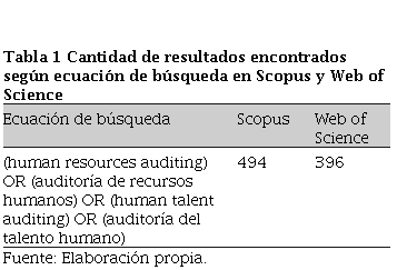 96.579 resultados para Web of Science, posteriormente esta ecuación se va depurando, de manera que el número de resultados encontrados contenga únicamente resultados que se asocian a la auditoría de recursos humanos, siendo la ecuación (human resources auditing) OR (auditoría de recursos humanos) OR (human talent auditing) OR (auditoría del talento humano) la que finalmente se implementó para efectos de la realización de este estudio, arrojando un total de 494 resultados encontrados en Scopusy 396 resultados econtrados en Web of Science (Tabla 1).