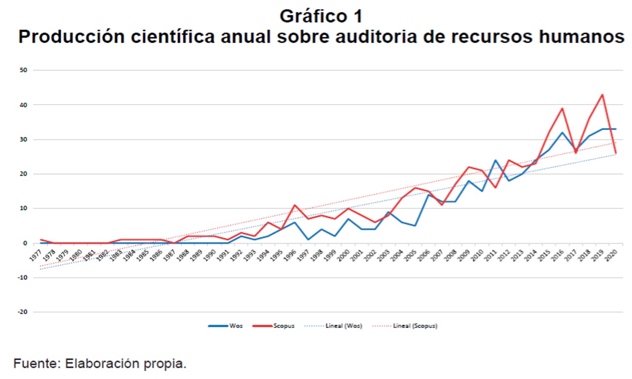 La base de datos Scopus es la primera red que registra publicaciones asociadas a la auditoría de recursos humanos, siendo el año 1977 donde se encontró el primer documento. Por su parte la plataforma Web of Science, registra su primera publicación en el año 1992. En términos generales la base de datos más relevante para la búsqueda sobre la auditoría de recursos humanos es la base de datos Scopus, superando en muchos períodos al volumen de resultados encontrados en la plataforma Web of Science. Cabe destacar que en el año 2011 se revierte esta tendencia, es decir, en este periodo, Web of Science superó en términos de resultados encontrados, a la base de datos Scopus. Desde el año 1977 hasta el año