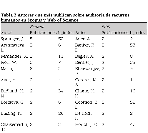 En lo que respecta a la contribución al tema de auditoría de recursos humanos por autores (tabla 3), Spranger J. es el autor más relevante en términos de publicaciones realizadas, contando con un índice h de 52. El índice h es una métrica que equilibra el número de citas por artículo de un autor en relacion con su producción científica, donde la cantidad de citas es menor o igual al número de orden de un artículo en una revisión descendente de cita (Hirsch 2005). Tomando como referencia este indicador (índice h), el autor más relevante es Banker R. D. quien posee 2 publicaciones y un índice h de 53.