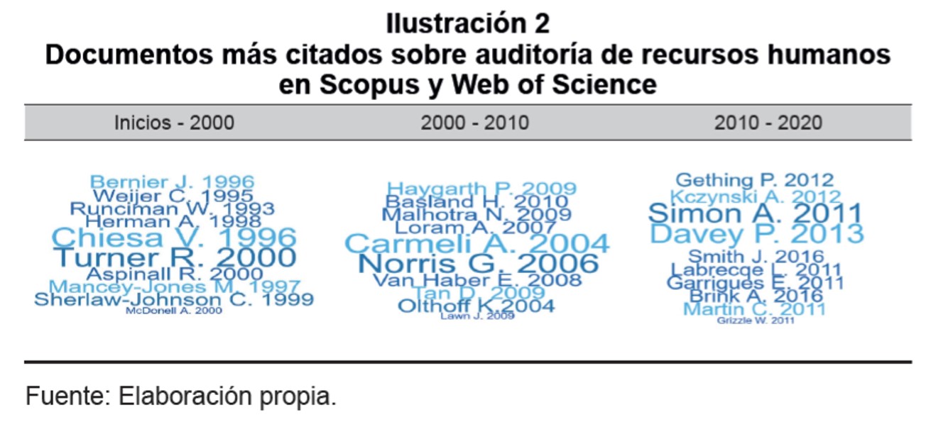 Se realizó un análisis a los documentos que registran un mayor nivel de citas a lo largo del tiempo en la producción científica sobre auditoría de recursos humanos en Scopus y Web of Science, para lo cual los documentos fueron divididos en 3 grupos (ilustración 2), inicialmente se encuentran los documentos hasta el año 2000, posteriormente se encuentra el segundo grupo, el cual registra los documentos encontrados desde al año 2000 hasta el año 2010 y finalmente, en el tercer grupo se encuentran los documentos desde el año 2010 hasta la actualidad. Entre los artículos más citados que datan desde los orígenes de la producción científica en Scopus y Web of Science, se encuentra a Chiesa et al, (1996) quienes proponen el desarrollo de una auditoría de innovación técnica, aplicando revisiones basada en cuadros de mando de la innovación y una auditoría en profundidad, el documento cuenta con un total de 666 citas en ambas bases de datos, cabe destacar que dentro de la base de datos Scopus, este documento se posiciona como el más citado con 380 registros. Dentro del mismo grupo de autores también aparece Turner (2000) quien escribe sobre la integración de las ciencias naturales y socioeconómicas en la gestión costera, el documento cuenta con un total de 259 registros en ambas bases de datos.