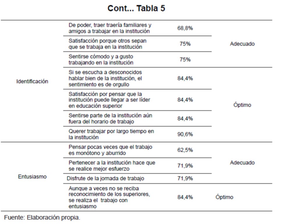 La identificación y el sentido de pertenencia generan un compromiso en el trabajador; el mantener el entusiasmo le permite la mejora del espacio compartido, favorece el clima organizacional y facilita el trabajo colaborativo.