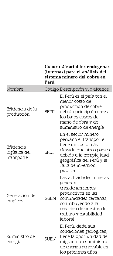 A partir de una cuidadosa búsqueda documental y un previo análisis retrospectivo teórico del sector minero, que incluyeron los clásicos análisis PEST y de fuerzas de Porter, se propusieron y validaron con algunos de los expertos participantes las 12 variables para el sistema de la minería del cobre de Perú. Dichas variables fueron categorizadas, según su naturaleza, en variables exógenas (Cuadro 1) y variables endógenas (Cuadro 2) para el sistema estudiado. En los cuadros antes mencionados se presenta también una breve descripción y alcance de cada una de dichas variables para su mejor entendimiento.