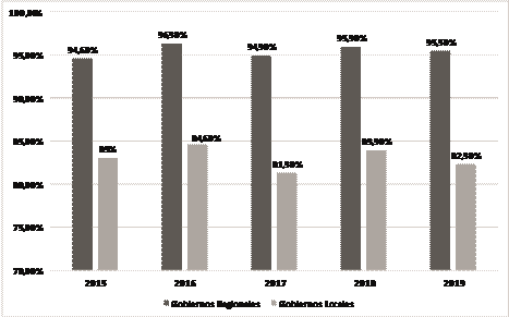 Como se observa en el gráfico 1, cuya data fue hallada en la consulta amigable del portal de transparencia económica del Ministerio de Economía y Finanzas, en Perú, los gobiernos locales vienen logrando una ejecución presupuestal inferior a los gobiernos regionales, estos últimos presentan una tasa promedio de crecimiento en la ejecución en 0.23%, mientras que los gobiernos locales presentan una tasa de decrecimiento promedio igual al -0.18% en los últimos 5 años para el logro de los productos de sus diversas categorías presupuestales y sectorizadas.