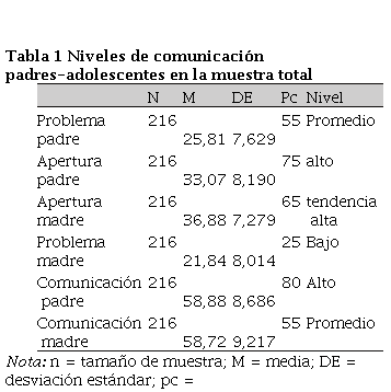 A nivel de la muestra total, la puntuación global en comunicación es similar respecto de ambas figuras parentales; sin embargo, se aprecia un nivel más elevado de apertura en relación con la madre y de problemas de comunicación frente al padre, lo cual corrobora los resultados observados en otros contextos culturales y geográficos.
