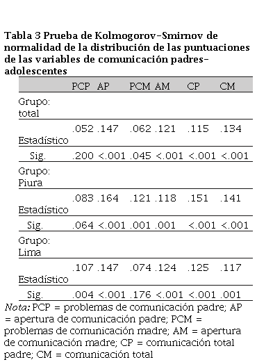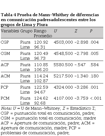 Los resultados de la Tabla 3 indican que las variables de comunicación padres-adolescentes se distribuyen de manera no normal en ambos grupos (excepto en el caso de problemas de comunicación en el grupo de Piura), por lo que la comparación de las puntuaciones entre ambos grupos se realizó mediante la prueba U de Mann-Whitney.