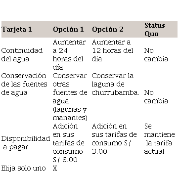 La encuesta se desarrolló en el mes de enero del 2020 con una población muestral de 400 hogares usuarios del agua potable, donde se entrevistó personalmente al jefe del hogar responsable de las facturas del agua todos los meses. El cuestionario se dividido en capítulos: Características sociodemográficas, atributos y la disposición a pagar. Se les proporciono una serie de cuestionarios de opciones múltiples en los que las opciones de elección para los atributos del servicio de agua difieran según los conjuntos de opciones.
