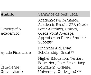 En esta línea, el presente artículo ha tomado una muestra de 70 artículos sobre el desempeño académico con ayudas financieras, entre los años 2015 y 2021, para identificar los indicadores de éxito estudiantil y establecer relaciones entre tipos de ayuda, desempeño y variables de contexto.