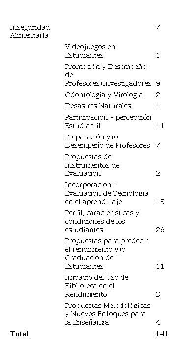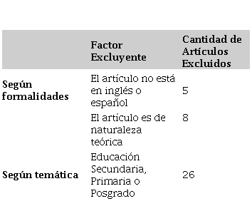 De la búsqueda de literatura se obtuvieron 237 artículos para las siguientes categorías: “Investigación en Educación”, “Economía”, “Educación de Disciplinas Científicas”, “Ciencias de la Información”, “Medicina General Interna”, “Ciencias Sociales Interdisciplinarias”, “Sociología”, “Medio Ambiente y Salud Ocupacional”, “Ciencias Multidisciplinarias” y “Educación Especial”. De esta muestra se excluyeron 141 artículos por factores de temas que se escapan al objetivo de esta revisión de literatura y factores de formalidades que impiden un análisis completo del artículo. Esos factores están detallados en la Tabla 2.