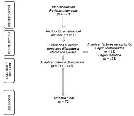 De esta forma, considerando los artículos recopilados que quedan excluidos de la revisión, por factores no pertinentes a este estudio, se aceptaron 70 artículos en total que cumplen con los siguientes requisitos: pertenecer a una investigación publicada entre 2016 y 2021, en una publicación de indexación WoS, Scopus o Scielo, que responda a los términos de búsqueda relativos a desempeño académico, ayuda financiera y estudiante universitario, y sus respectivos booleanos de extensión.