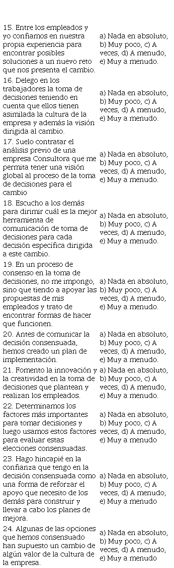 Se adjunta a continuación el cuadro con los componentes (cuadro1) y después el test en sí (cuadro 2). Este es test al completo, preparado para extraer datos significativos acerca de estos componentes en una muestra significativa en un caso de empresa único o un caso múltiple de empresas. El cuestionario debe ser completado por los directivos.