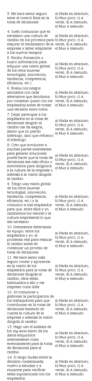 El líder planifica los procedimientos eficaces para la toma de decisiones y estilo participativo tanto de directivos, mandos intermedios y empleados. Esto implica que el Ceo despliegue habilidades socioemocionales para influir y atraer a los demás hacia una causa (Carnegie, 1969; Goleman 1995, 2008). Igualmente sabe generar una cultura del consenso (Roberto, 2013) acerca de problemas y evaluación de los riesgos. Si cabe, este debe tener en cuenta que la votación en la toma de decisiones de los sujetos que participan y se implican, importa, es decir, tiene un valor constructivo (Sánchez, 2011) puesto que enriquece y es determinante para que la empresa progrese.