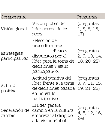 En este modelo el protagonismo lo ostentan tanto el líder como los empleados empoderados. Se plantean cuatro componentes acerca del líder. El primer factor de este modelo es acerca de la cualidad de visión global del líder acerca de los retos que acechan por las condiciones externas o internas a la empresa y la necesidad de cambios. Esta cualidad requiere que el líder se forme constantemente, busque información a través de herramientas adecuadas, como los big data, se deje aconsejar de forma externa cuando sea necesario de forma que adquiera conocimiento suficiente de los retos y contenga ideas claras relevantes al respecto, así como de la imagen positiva o negativa proyectada (Caldevilla et al. 2019).