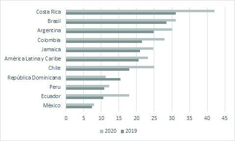 Para la OIT (2020c) las principales cifras sobre la problemática del desempleo juvenil en la región latinoamericana se muestran en el gráfico 1, lo que evidencia que algunos países como Costa Rica, Brasil y Argentina presentan las tasas más altas de desempleo juvenil. En Costa Rica particularmente el desempleo juvenil aumentó en más de diez puntos porcentuales del 2019 al 2020, pasando de un 31.1% a un 42,1%. Por otro lado, en los casos de México, Ecuador y Perú, el desempleo juvenil resulta mucho más bajo. Sin embargo, en estos países las tasas de empleo juvenil informal son muy altas, según el mismo reporte.