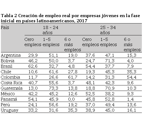 El estudio del GEM (2018) revela que algunos de los países latinoamericanos destacan en el tema de creación de empleo. Por ejemplo, para el caso de Colombia, casi un 62% de los emprendedores entre 18 y 24 años están contratando más de seis empleados, y en el rango de edad entre 25 y 34 años, el porcentaje llega casi al 55%.