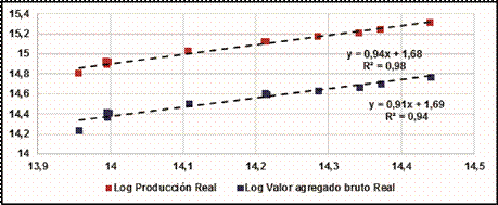 Al llevar las variables a logaritmos, y donde el coeficiente de elasticidad del consumo intermedio versus el PIB real y producción total es igual a la pendiente de la recta de regresión lineal; es decir un incremento del 1% del consumo intermedio[2], solo produce un incremento del 0,94% de la producción y 0,91% del valor agregado bruto. Vale decir, el rendimiento delos insumos empleados en la producción es menos que proporcional al producto creado.