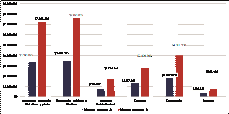 Igualmente, en los sectores de las medianas empresas A y B, tal como se muestra en el gráfico 2 en concordancia con lo expuesto en el gráfico 1, las organizaciones empresariales que se desempeñan en las áreas productivas de construcción, explotación de minas y canteras y agricultura, ganadería, silvicultura y pesca, son las que presentan mayores niveles de ingresos nominales promedios anuales; lo cual pudiera explicarse por varias razones: 1) mayores márgenes de inversión y/o valor agregado; y 2) sumado a menores niveles de competitividad. Luego sigue comercio, los servicios y manufacturas donde sin duda alguna existen mayores niveles de competitividad, ya que son las actividades económicas de la provincia de El Oro donde existen un mayor número de unidades de producción.
