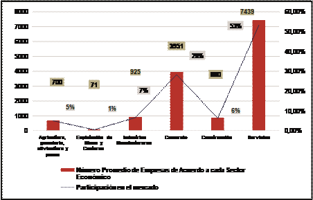 Por su parte, Romero, Melgarejo y Vera-Colina (2015) señalan que la concentración de PYMES en Colombia se encuentra principalmente en la ciudad de Bogotá y en los departamentos como Antioquia, Valle del Cauca y Cundinamarca. Se considera a Bogotá como el principal centro de negocios nacional, con una participación en el PIB de 24,4%, siendo las ramas de actividad con mayor participación: 1) los establecimientos financieros, seguros actividades inmobiliarias, y servicios a las empresas representan 36,8%; 2) los servicios sociales, comunales y personales con 19,3%: 3) comercio, reparación, restaurantes y hoteles 15,5%; y 4) la industria manufacturera contribuye con 10,3%. Asimismo, el tejido empresarial de la ciudad se caracteriza por una amplia base de microempresas (87%) y se encuentra el mayor número de pequeñas (9%) y medianas empresas (4%) y grandes empresas (1%) (Romero, Melgarejo y Vera-Colina, 2015).