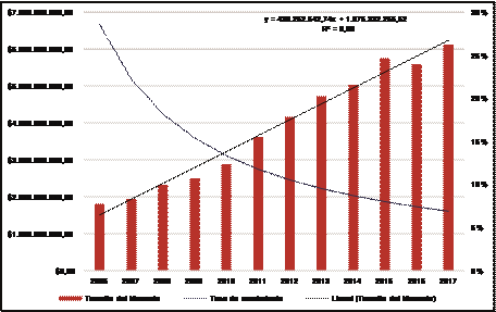 En el gráfico 5, se muestran las oportunidades y potencialidades que requieren con prontitud explotarse al máximo en un mercado como el de la provincia de El Oro. En efecto, en el gráfico se muestra en el tamaño del mercado (Ventas totales de los sectores económicos), que, si bien muestra una tendencia en términos absolutos crecientes con un incremento anual promedio de más de 430 millones de dólares, la tasa de crecimiento del total de las ventas en los diferentes sectores económicos en términos promedios es decreciente.