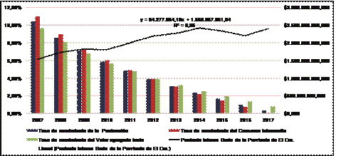 Lo antes expuesto, permitiría dinamizar la economía, crear mayores fuentes de empleo, elevar las tasas de crecimiento de la producción total, el valor agregado bruto en términos reales y obtener mayores tasas de crecimiento. Lo antes dicho mejoraría el comportamiento del PIB real de la provincia, ya que apenas se incrementa en unos 84,3 millones de dólares anuales como se muestra en el gráfico 7. Lo anterior representa apenas un 4% de crecimiento anual en valores promedio, en tanto la tendencia de las tasa de crecimiento del consumo intermedio, producción y PIB real es decreciente como se puede observar también en el gráfico n°7. De acuerdo a la tendencia antes citada, en algunos años la tasa de crecimiento el consumo intermedio supera a la del valor agregado bruto y producción total, lo que explicaría, sin duda alguna, cómo a partir del año 2012, todas caen por debajo del 4%, dándose de manera acelerada una tendencia al estancamiento económico.