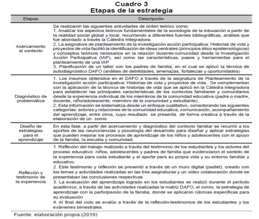 En función de la operatividad de la estrategia definida, se proyectó la interrelación positiva de los estudiantes de la carrera educación básica con los actores del contexto educativo (familia, escuela y comunidad). Para abordar esta estrategia, se articulan las asignaturas antes mencionadas, desde un enfoque sistémico que busca explicar la realidad de forma integral. Los estudiantes participantes deben aplicar la técnica de la historia de vida para elaborar un diagnóstico del contexto, a partir de la cual formulen propuestas de estrategias que aporten a los procesos de aprendizaje en los niños y adolescentes.