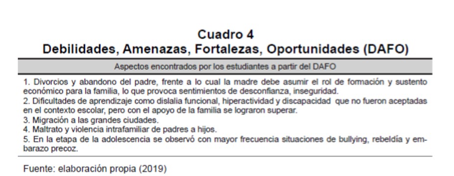 En otro orden de ideas, a partir de la aplicación del DAFO por parte de los estableció el diagnóstico de los contextos estudiantes participantes y la historia familiares (cuadro 4) que se sintetizan de vida de las familias abordadas, se en los siguientes aspectos: