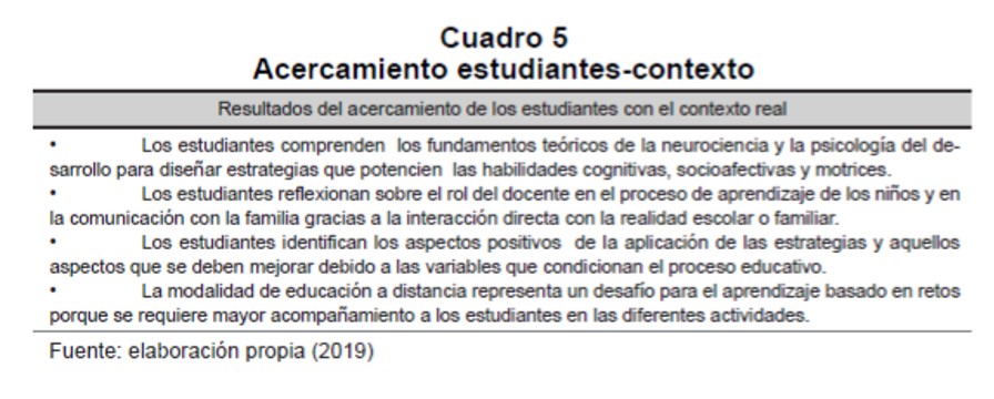Frente a estas circunstancias, la Universidad Técnica Particular de Loja (UTPL) en Ecuador, como institución con más de 50 años de trayectoria académica, ejerciendo procesos de formación, investigación, innovación, internacionalización y vinculación; apoyados en la implementación de nuevos enfoques, metodologías, estrategias y técnicas, para aplicar de forma innovadora lo que establece la malla curricular vigente. De allí que en la carrera de educación básica, durante el segundo período académico octubre 2019-febrero 2020, se asumió trabajar el aprendizaje basado en retos, como un camino para promover la integración curricular y la vinculación teóricapráctica. Este tipo de aprendizaje involucra al estudiante en un contexto real para resolver una problemática relacionada con el tema o temas de estudio (Malmqvist, Rådberg y Lundqvist, 2015).