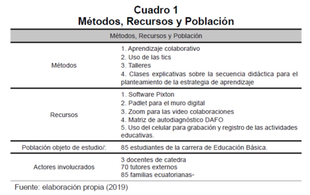 Los métodos de enseñanza, recursos empleados; así como la población objeto de estudio/ Actores involucrados se describen en el cuadro 1: