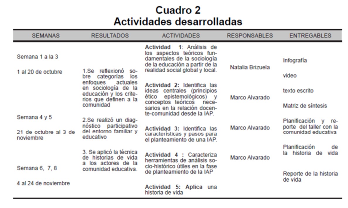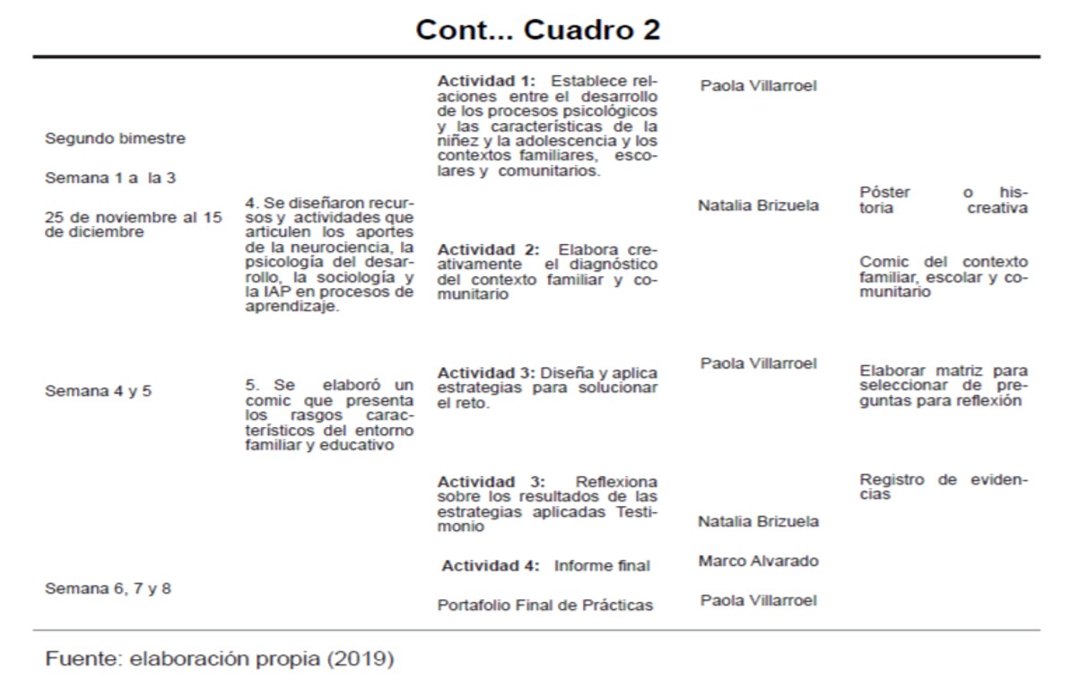 En relación con las actividades, estas se describen considerando recursos, responsables, tiempo, fecha, lugar de ejecución. En el cuadro 2, se plantean actividades de acuerdo a las 16 semanas que tiene el período académico, 8 del primer bimestre y 8 del segundo bimestre.