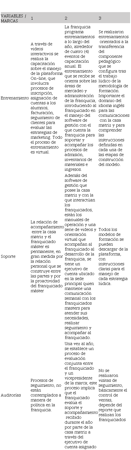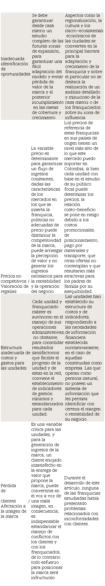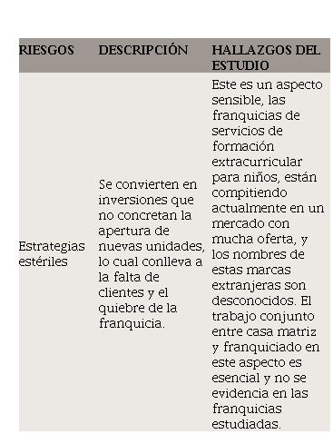 Los procesos de adaptación de franquicia, son un fenómeno poco estudiado por la literatura académica en Colombia, aun cuando este desarrollo empresarial está tomando fuerza y se populariza entre las estrategias de creación de empresa. Cuando un franquiciado motivado por el éxito de la marca en otros países y con base en la evolución del mercado local, decide invertir en una franquicia, opta por aquellas que mejor se ajuste a sus gustos e intereses, capacidad de inversión y familiaridad con el sector económico, sin embargo, los modelos de franquicia no son ejercicios empresariales eximidos de fracasos o reveses y no siempre es garantía de una inversión segura, en los anteriores apartados hemos explorado, a partir de la descripción de variables que operan el modelo de franquicias que se dedican a la prestación de servicios de formación extracurricular para niños, los riesgos que se detectan en el proceso de adaptación antes y después de la apertura de las unidades.