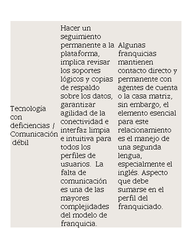 Los riesgos identificados anteriormente se agruparon en dos conceptos: 1) Riesgo de Desarrollo comercial; este riesgo circunscribe otros riesgos anteriormente descritos como perfiles inadecuados, estrategias estériles para la promoción de la marca, precios no competitivos, pérdida de clientes, afectación de la marca. Para la facilitar la adaptación de la marca el proceso de internacionalización requiere estudios profundos sobre las particularidades culturales y microeconómicas de la zona geográfica en la que se desea insertar el negocio, en Colombia las dinámicas económicas y de comportamiento son muy distintas entre ciudades, por tanto, precios y costos deben fluctuar y adaptarse para hacer viables las unidades franquiciadas.