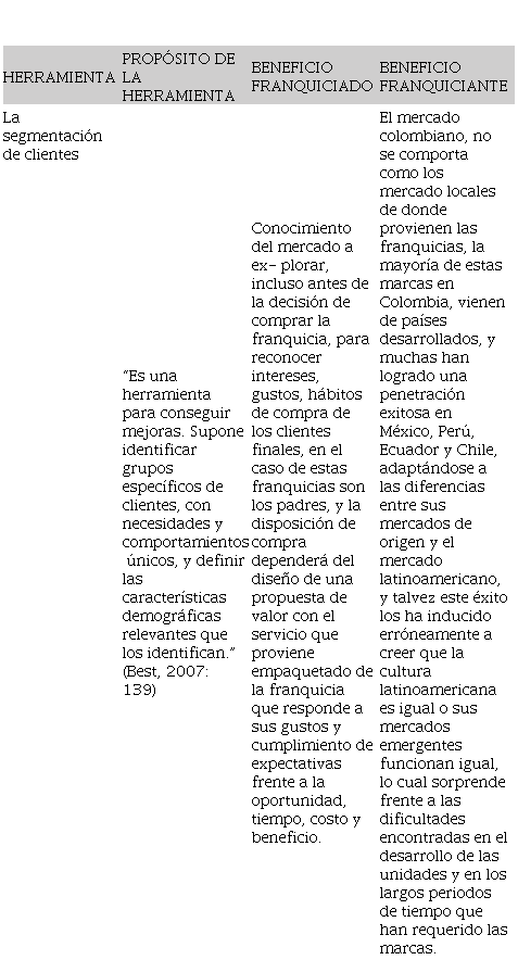 En este sentido, el estudio propone el análisis de variables que pueden afectar el éxito de la franquicia en Colombia, estableciendo los riesgos de adaptación potenciales para la marca y de esta manera contribuir al acervo académico y a la comprensión del fenómeno del desarrollo de franquicias en el país. Aun cuando el estudio se centra en empresas que prestan servicios de formación extracurricular para niños; los hallazgos del trabajo, podrían utilizarse y validarse en diferentes conceptos de franquicia. Otro elemento que incorpora este documento, es la propuesta de un modelo conceptual de aplicación de herramientas de contabilidad de gestión que ayude a mitigar los riesgos de adaptación identificados.