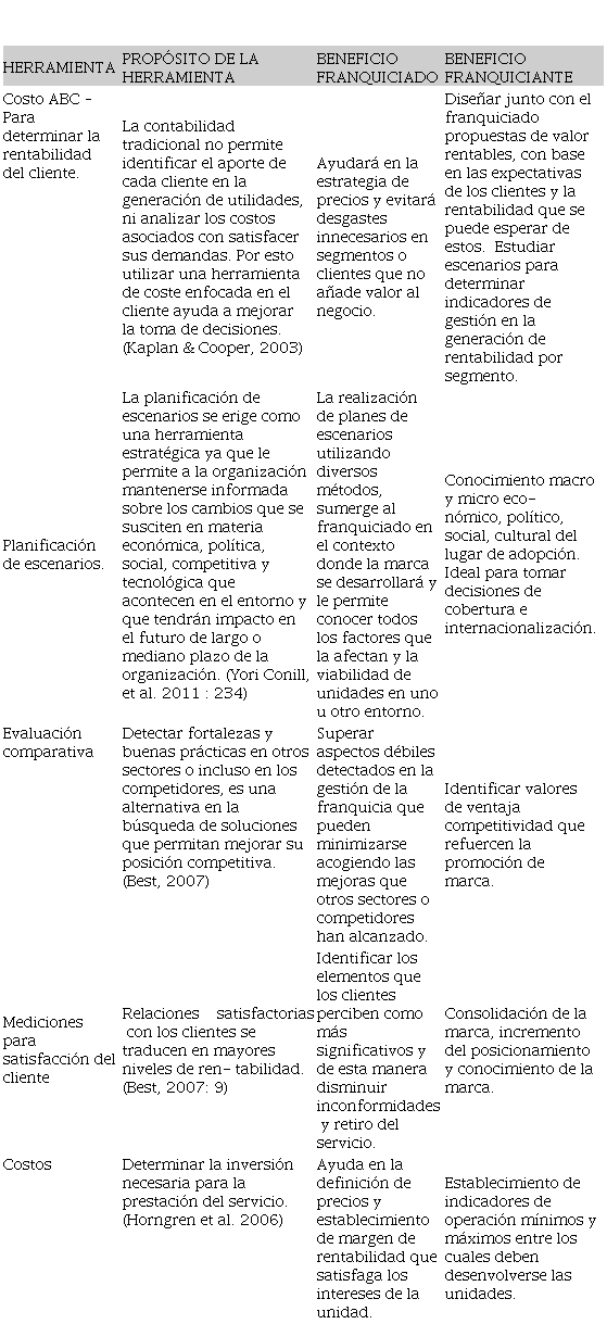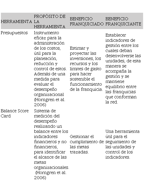 Sobre la implementación de herramientas y de los conceptos de contabilidad de gestión en los modelos de franquicia y sus posibles resultados, no fueron encontrados para el caso colombiano.