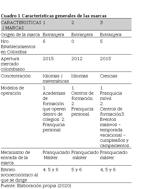 Para esto, un primer acercamiento a la caracterización de las franquicias se obtuvo de fuentes secundarias ubicadas en páginas web de las franquicias, noticias, programas de actualidad, revistas y videos en la internet. Como es habitual en el modelo de franquicia, el establecimiento de acuerdos de confidencialidad, no fue posible acceder a documentos privados, tales como contratos, manuales de operación, procedimientos, presupuestos o acceso a la tecnología utilizada y manteniendo esta condición de reserva, a continuación, se enuncian en el Cuadro 1 las características generales de las marcas, sin mencionar sus nombres reales.