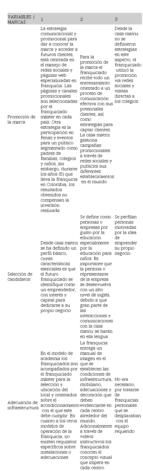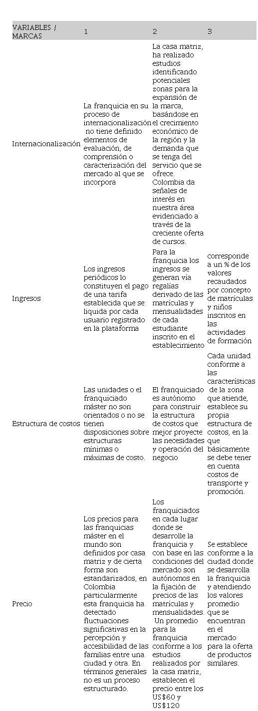 Se observa que las marcas referenciadas ofertan sus servicios para los estratos socioeconómicos más altos de la población y sus mecanismos de entrada se soportan sobre la estrategia de franquiciado máster, lo que significa el otorgamiento de derechos de explotación del formato de negocio en un territorio amplio, en los casos observados implica el desarrollo de la marca en todo el territorio nacional.