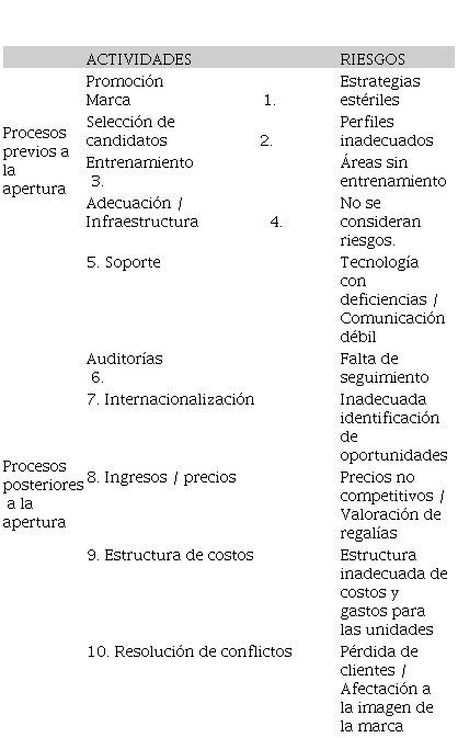En el Cuadro 5 se enuncian relacionados para las marcas objeto de para cada uno de los riesgos en la estudio. adaptación de franquicias, los hallazgos