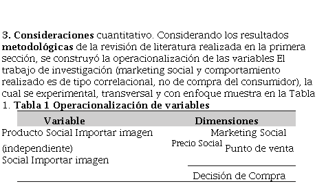 Considerando los resultados metodológicas de la revisión de literatura realizada en la primera sección, se construyó la operacionalización de las variables El trabajo de investigación (marketing social y comportamiento realizado es de tipo correlacional, no de compra del consumidor), la cual se experimental, transversal y con enfoque muestra en la Tabla 1