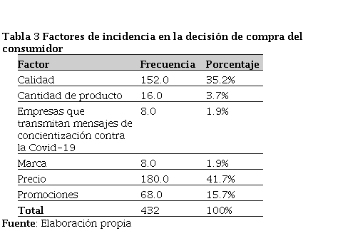 La tabla 3 muestra los resultados donde los encuestados expresaron que factor tiene mayor incidencia al momento de decidir una compra.