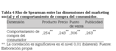 Se totalizaron las respuestas a las 8 preguntas correspondientes a cada una de las 4 dimensiones de la variable marketing social; así como las respuestas a las 4 preguntas ligadas a las 4 dimensiones de la variable comportamiento de compra del consumidor, los totales fueron sometidos al test de normalidad de Kolmogorov – Smirnov, el cual mostró como resultado la ausencia de normalidad en todas las dimensiones de las variables. Por lo que, para medir la correlación entre cada una de estas dimensiones y el comportamiento de compra del consumidor, se empleó el test de correlación (rho) de Spearman. El análisis estadístico de las correlaciones se muestra en la tabla 4.
