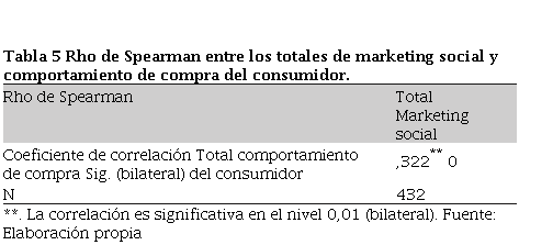 La nube de puntos que se observa en el gráfico 1 refleja la tendencia positiva entre las variables, esto quiere decir que mientras aumenta el total de la variable marketing social (independiente), la variable comportamiento de compra del consumidor (dependiente) también lo hace. Para conocer la intensidad de la correlación entre las variables se realizó el test de Spearman, el análisis estadístico se presenta en la tabla 5.