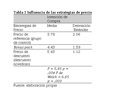 Los resultados muestran que hay un efecto significativo de las estrategias de precios sobre la intención de compra (F= 5.93; p= .004). Como se muestra en la Tabla 1, en promedio la intención de