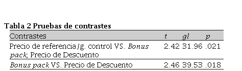 Los contrastes planeados revelan que, tal y como se esperaba, las estrategias de precio ya sea Bonus pack o Descuento Novel incrementan significativamente la intención de compra respecto al grupo de control en donde no se ejerce ninguna promoción, t (31.965) = 2.420, p= .021. Asimismo, y en congruencia con la hipótesis propuesta en esta investigación, los resultados de los contrates muestran que las estrategias de precio Descuento Novel incrementan significativamente la intención de compra, t (39.534) = 2.465, p= .018 (Tabla 2).