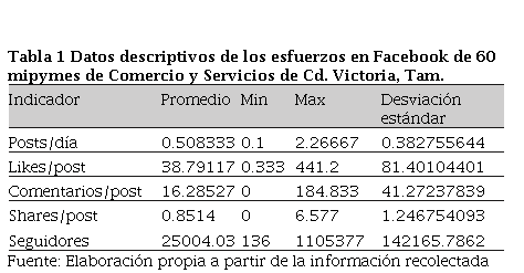 Las mipymes tienen una gran oportunidad con el uso de los medios sociales; sin embargo, hasta ahora, no han sabido explotar apropiadamente los beneficios de su uso, razón por la cual, la red social Facebook, como una plataforma para las acciones de mercadotecnia de la mipymes de Ciudad Victoria, Tamaulipas, México, debe concebirse de manera estratégica no se trata solo de tener presencia en la red, consiste en alcanzar valores de intensidad, riqueza y capacidad de respuesta que logren generar interacciones que se conviertan en el corto, mediano y largo plazo en fidelidad, confianza y sobre todo en información valiosa para orientar las estrategias que las empresas deben llevar a cabo en los medios sociales.